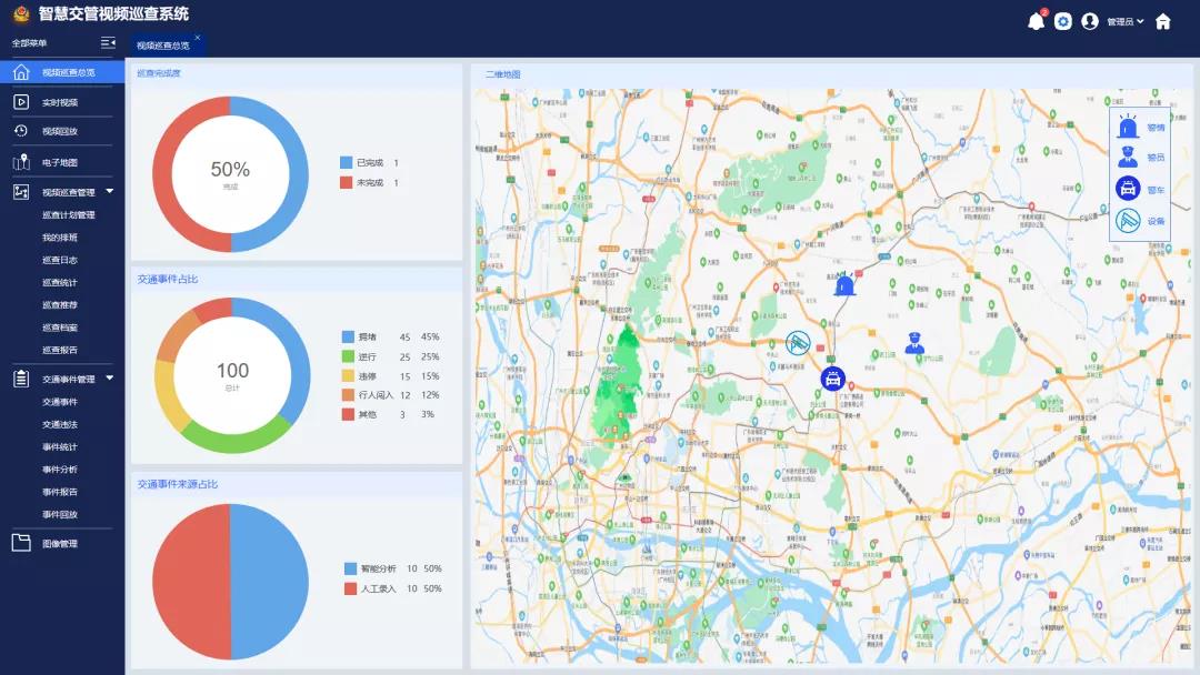 一图总览,视频巡查完成度、交通事件占比、交通事件来源占比图表统计,交通态势一目了然;设备、警情、警员、警车二维地图定位,巡查治理直观便捷。警员排班治理、巡查计划治理、巡查报告日志,智能化、自动化开展巡查事情,有利于警力资源的合理分派,降低一线交警事情强度。